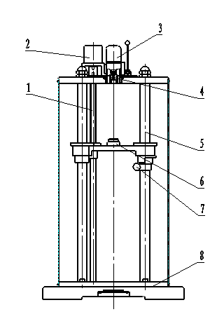 l 1 丝杠 2 步进电机 3 点火装置4 药柱模 5-立柱 6 试样模 7 锁紧旋钮 8底座